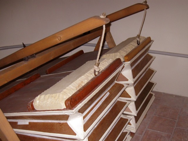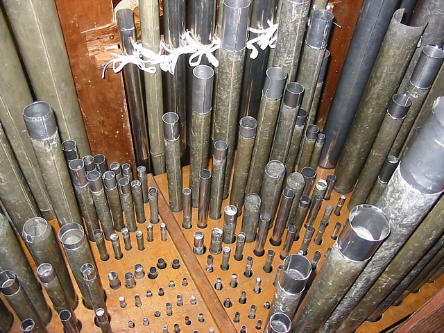 Interno dello strumento dopo il restauro, con le canne in piombo restaurate ed allungate ove necessario al ripristino del corista originale.