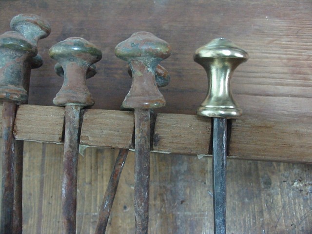 Saggio di pulitura dei pomelli della meccanica dei registri in ottone tornito, con segni di riverniciatura e ossidazione.