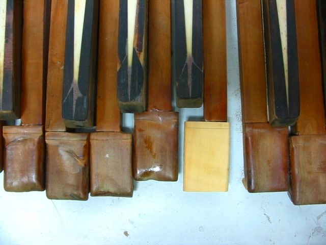 Integrazione sulla tastiera dell'organo della Chiesa Madre di Montalbano Jonico (MT): le parti mancanti sono state ricostruite con materiali omogenei (legno di bosso ed ebano).