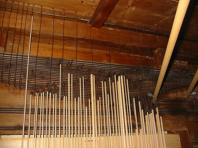 Meccanica di trasmissione della tastiera con tiranti ricostruiti in listello di legno.