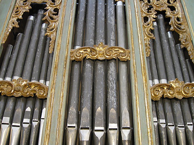 Singolare la disposizione delle canne lignee di basseria, posizionate interamente ai lati della cassa su lunghi trasporti anziché sul retro dello strumento.