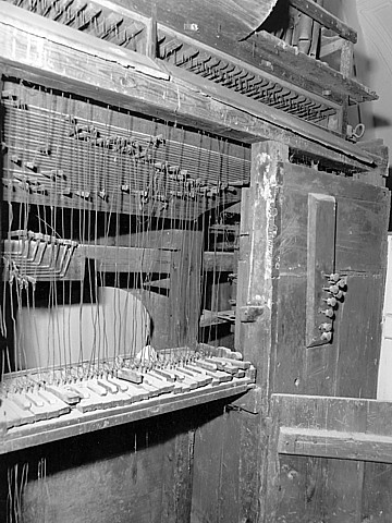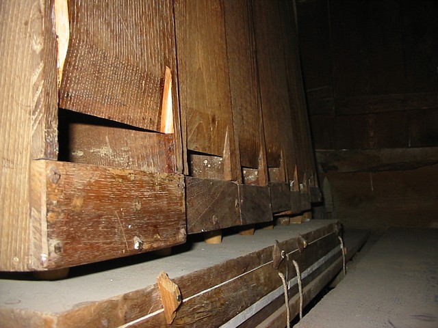 Somiere maestro a tiro in noce con sette stecche entranti; somiere di basseria in noce privo di sistema di esclusione; crivello in pioppo con bocche sottostanti
