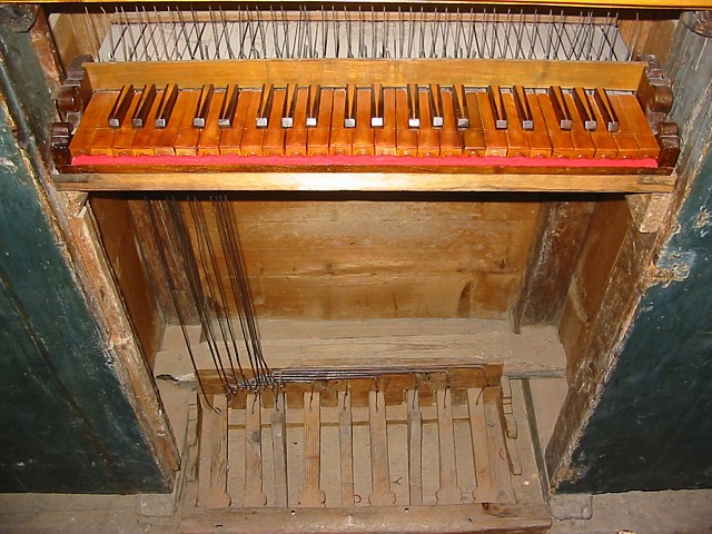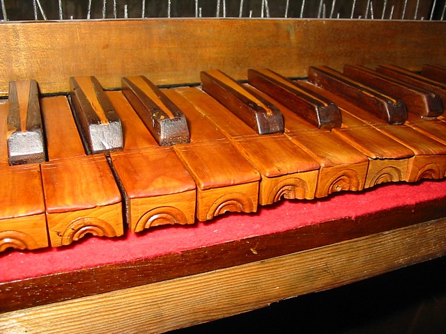 Tastiera di 45 tasti (Do1 - Do5 con prima ottava corta). Tasti diatonici ricoperti in bosso, cromatici in ebano, frontalini a chiocciola in bosso