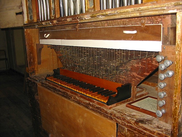 Vista della consolle a finestra con tastiera, catenacciatura e pomelli dei registri.