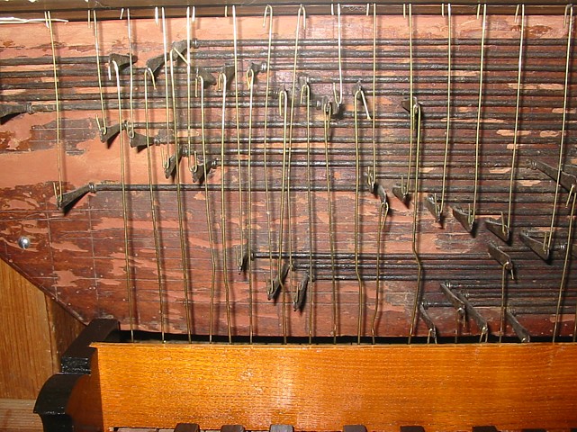 La tavola della catenacciatura della tastiera, prima del restauro, mostra i segni di una importante infestazione da tarlo.