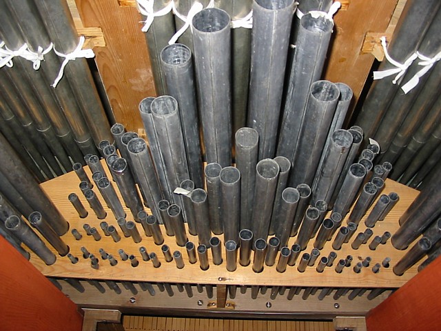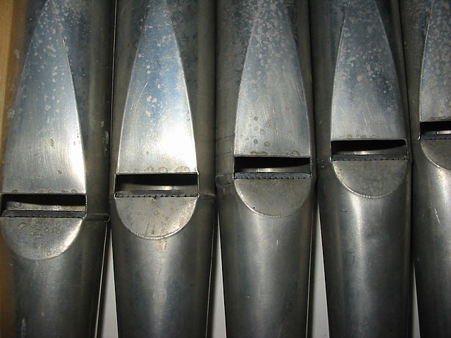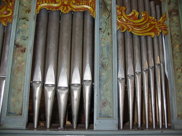 Facciata di 19 canne in stagno, dal Sol2 del Principale, disposte in 3 campate (7 - 5 - 7) con andamento a unica cuspide centrale