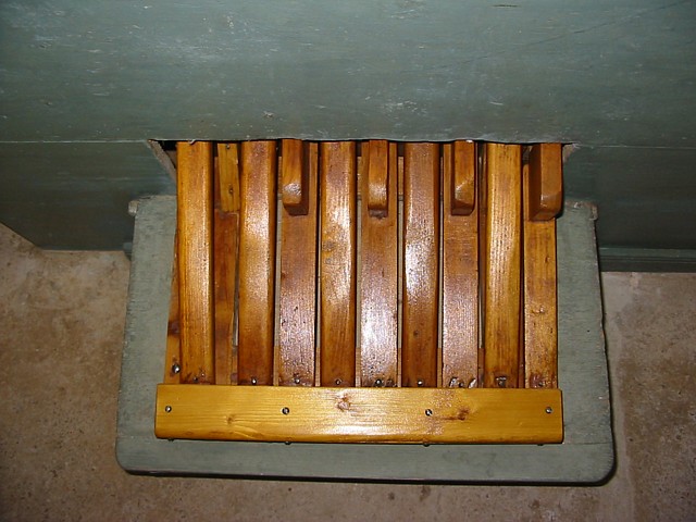 Somiere maestro a tiro in noce con quattro stecche entranti; quattro somierini di basseria ospitanti complessivamente 15 canne in abete non escludibili; crivello in abete con bocche sottostanti